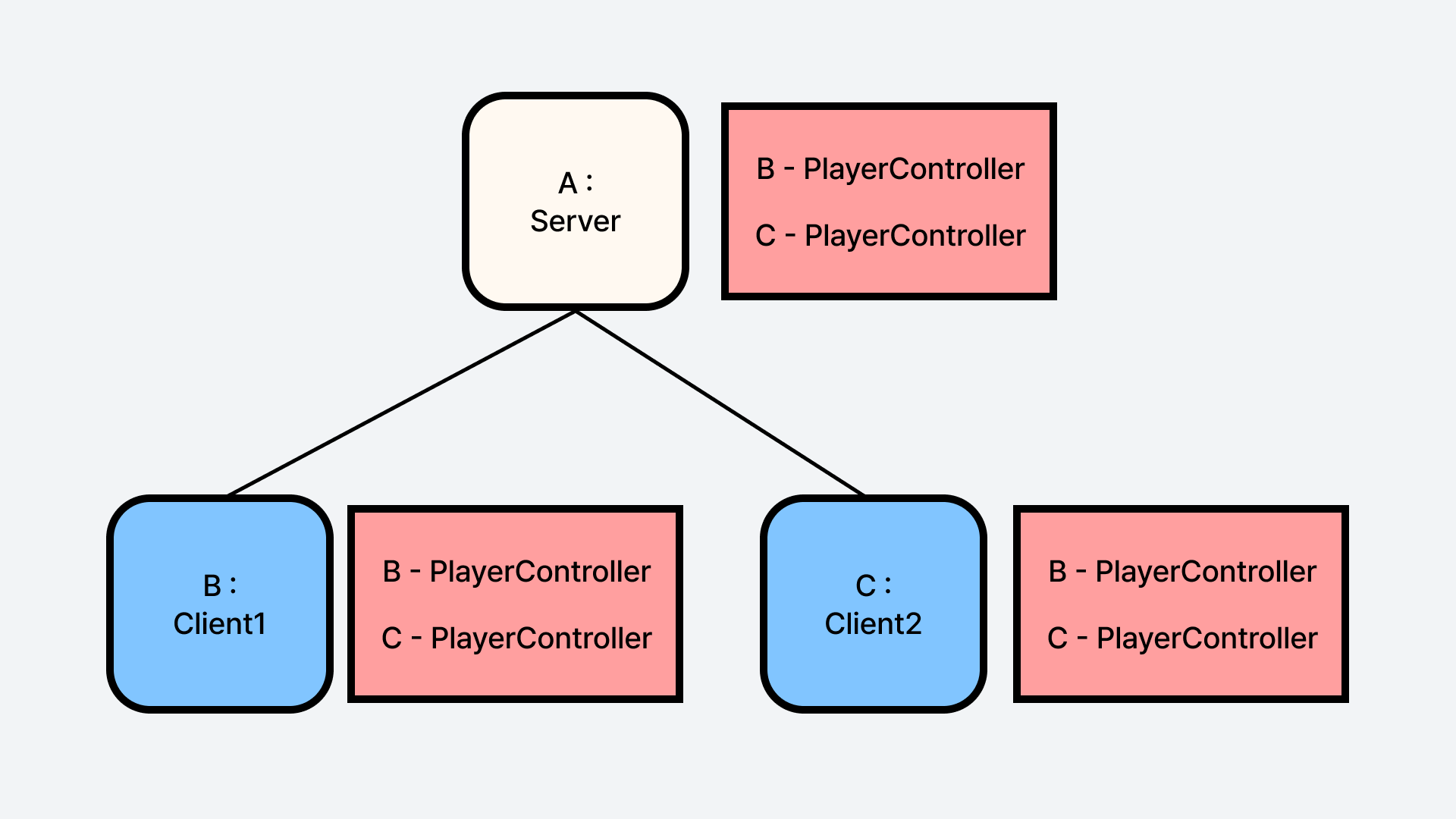 데디케이티드 서버를 A, 클라이언트 1을 B, 클라이언트 2를 C라고 하겠습니다. 편의상 나는 B라고 해봅시다. 이렇게 나타낼 수 있습니다.