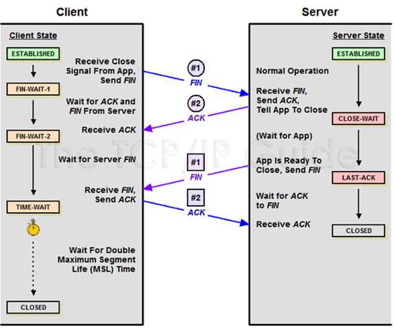 - 클라이언트는 서버의 FIN 플래그를 수신받고 확인했다는 신호인 ACK를 보냄(이때 연결종료 플래그인 FIN을 받고 뒤늦게 도착하는 데이터가 있을 수 있으므로 잠시동안 TIME-WAIT상태에 있다가 종료)