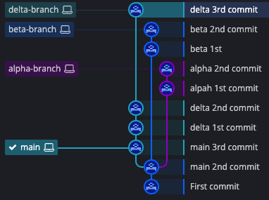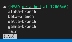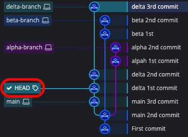 ^ 또는 ~ 갯수만큼 이전으로 이동 가능git checkout HEAD^^^, git checkout HEAD~3git checkout HEAD^^ in delta-branch