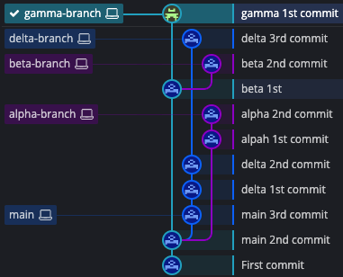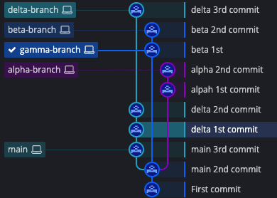 HEAD가 beta의 이전 커밋에 위치한 상태에서 새 브랜치(gamma-branch) 만들기
