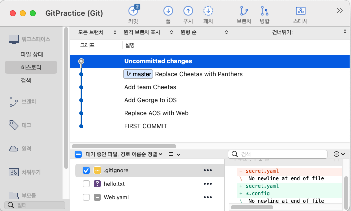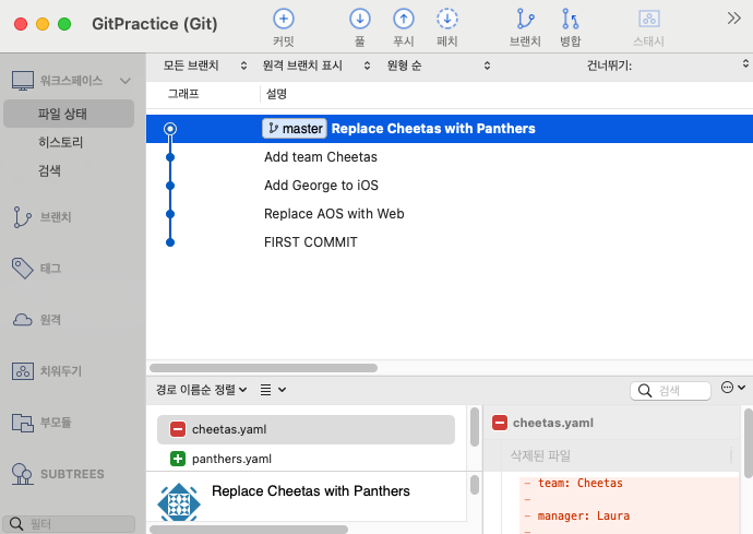 "Replace Cheetas with Panthers" (νμμ )cheetas.yaml νμΌμ μμ νκ³ panthers.yaml μ μΆκ°,Web.yaml μ manager λ₯Ό Me μμ Noraλ‘ μμ ν λ΄μμ΄ μλ€."Add team Cheetas" (λ°λ‘ μ΄μ )cheetas.yaml νμΌμ΄ μ΄μμμ.git reset --hard (λμκ° μ»€λ° ν΄μ)