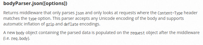 Returns middleware that only parses json and only looks at requests where the Content-Type header matches the type option. This parser accepts any Unicode encoding of the body and supports automatic inflation of gzip and deflate encodings.
