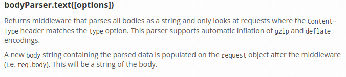 Returns middleware that parses all bodies as a string and only looks at requests where the Content-Type header matches the type option. This parser supports automatic inflation of gzip and deflate encodings.