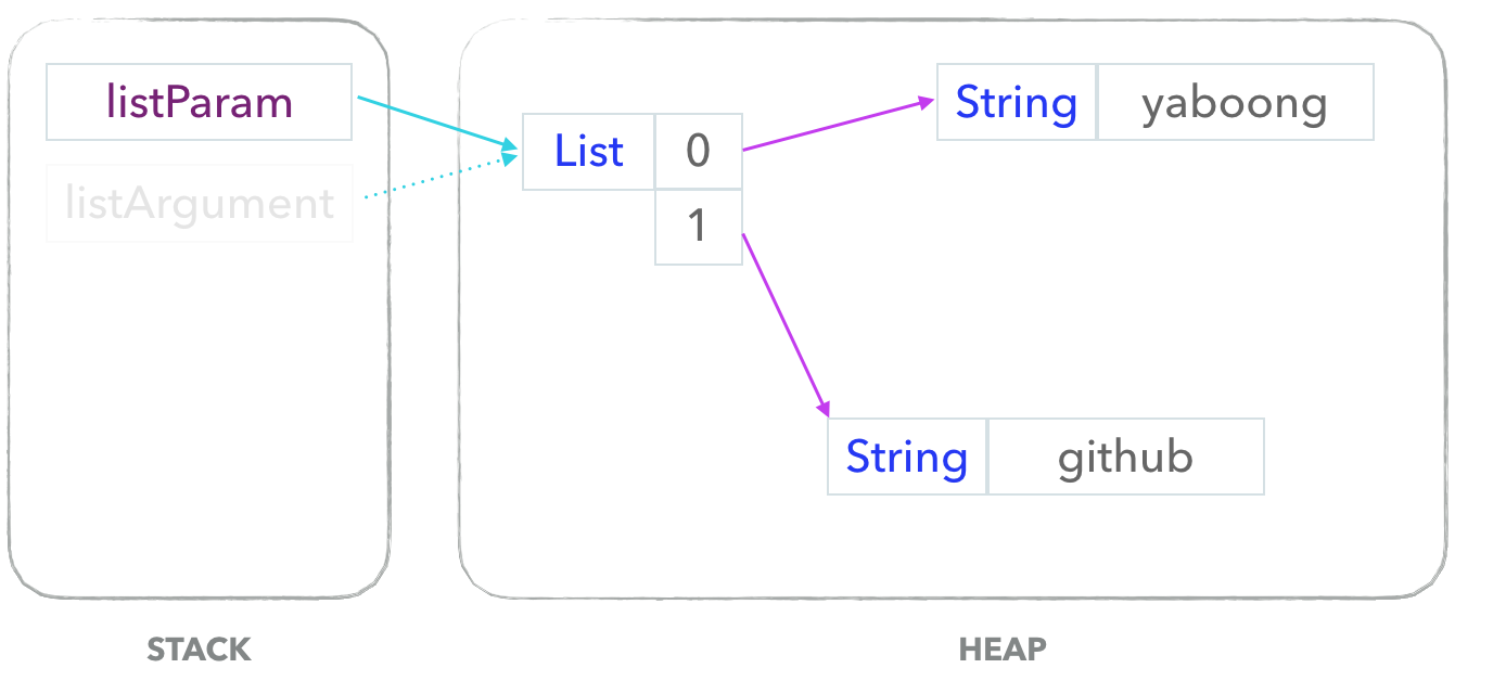리스트를 선언하면, stack에 LList를 저장할 공간이 힙 영역에 있는지 확인 후 List를 참조하는 list를 스택 영역에 할당한다. 리스트에 요소들이 add 될 때마다 인덱스에서 또다른 데이터에 대한 참조 값을 가진다.