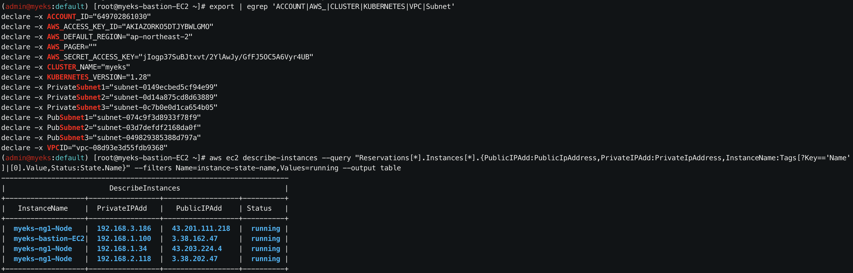 # 노드 IP 주회 및 노드의 프라이빗 IP를 환경변수로 지정aws ec2 describe-instances --query "Reservations[*].Instances[*].{PublicIPAdd:PublicIpAddress,PrivateIPAdd:PrivateIpAddress,InstanceName:Tags[?Key=='Name']|[0].Value,Status:State.Name}" --filters Name=instance-state-name,Values=running --output table