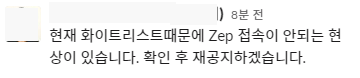 위의 문장에서 "Zep 접속이 안되는 현상"은 화이트리스트에 의해 일부 사용자나 시스템이 Zep에 접근할 수 없게 되었을 가능성을 시사하고 있다.