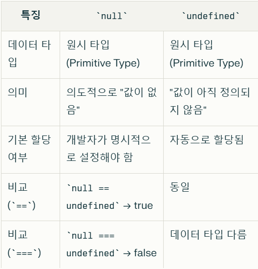 원시 데이터 타입(Primitive Data Type) 중 하나로, "값이 없음" 또는 "의도적으로 비어 있음"을 나타냅니다. 이는 개발자가 명시적으로 설정하는 값으로, 변수나 객체에 "아무 값도 없다"는 것을 표현하기 위해 사용됩니다.