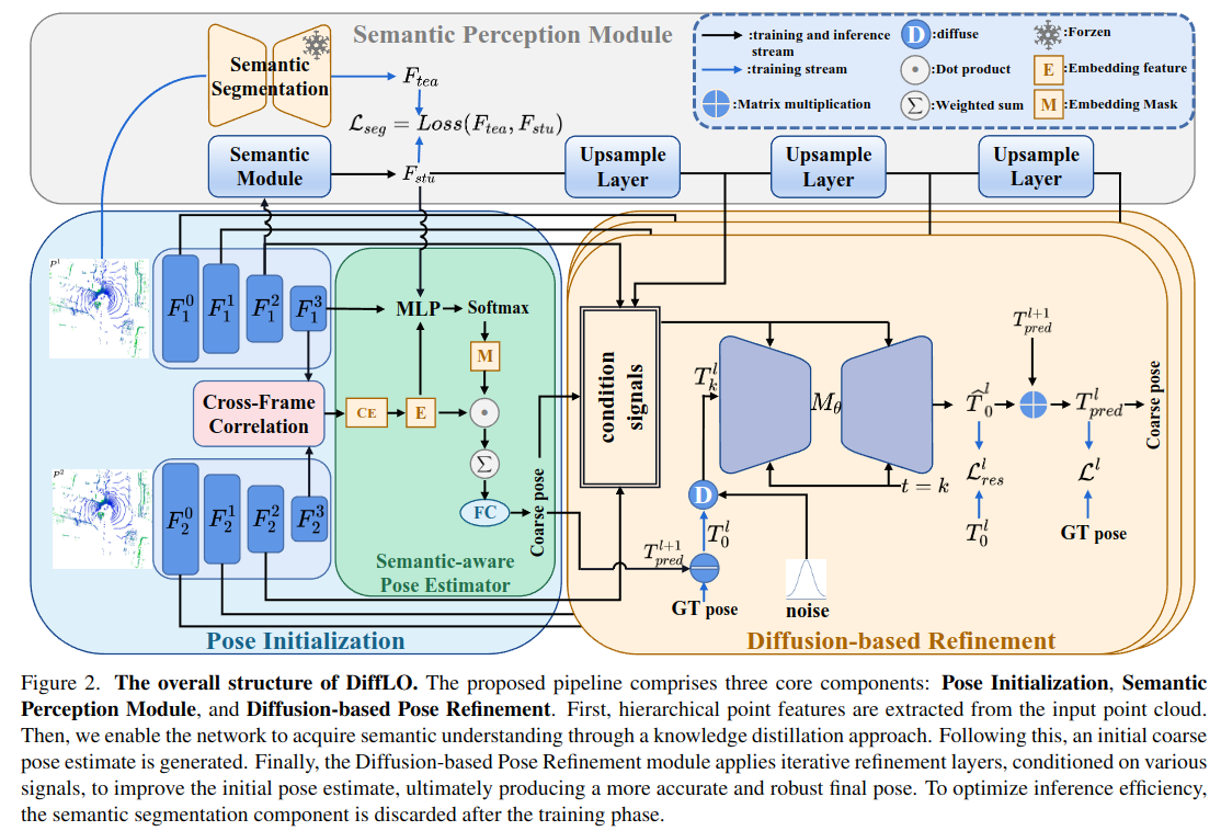 최근 Pose Diffusion 논문을 리뷰했던 적이 있는데, 이 논문을 Pose Diffusion을 사용하여 LiDAR Odometry task에 적용해보겠다는 방법을 제안함. 추가적으로 Semantic Distillation을 도입하여 dynamic, repetitive patterns, low textures에 강인함을 더했다고 함.