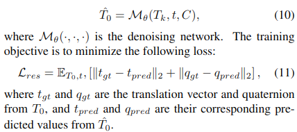 아래의 loss를 기반으로 denoising network를 학습. 학습의 목적은 GT residual pose와 예측된 pose의 translation 및 rotation 차이를 최소화.