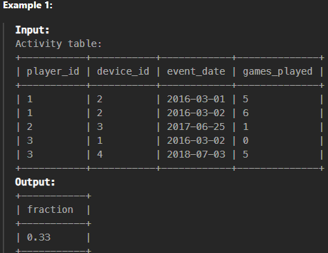 DATEDIFF가 '1'인 쿼리를 작성.- 테이블에 player_id가 중복되어 있고, player_id별 1개의 최초 로그인 기록을 가져오기 위해 윈도우 함수