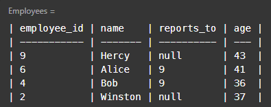 Write a solution to report the ids and the names of all managers, the number of employees who report directly to them, and the average age of the reports rounded to the nearest integer.
