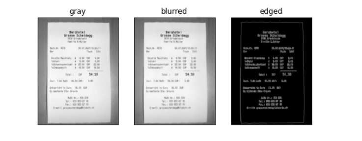 결과값으로는 아래와 같이 gray, blurred, edged image가 출력될 것이다.