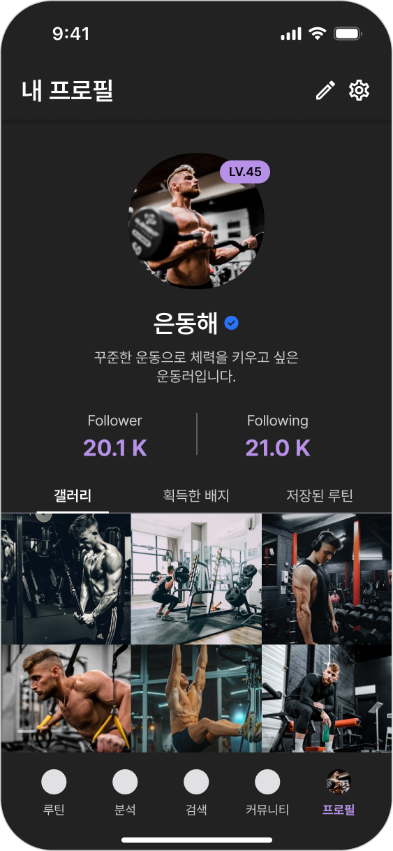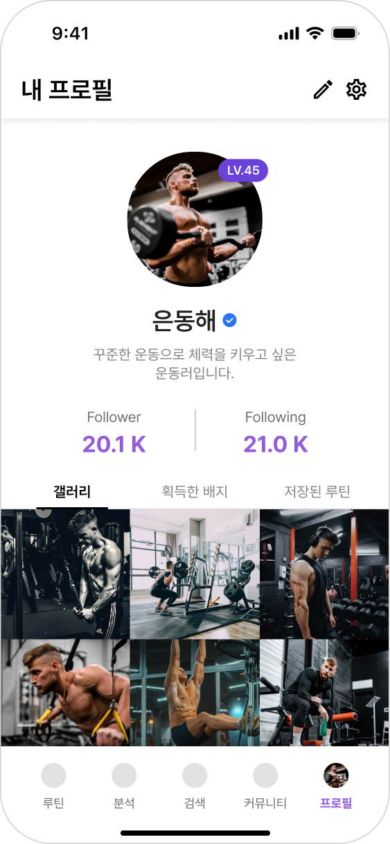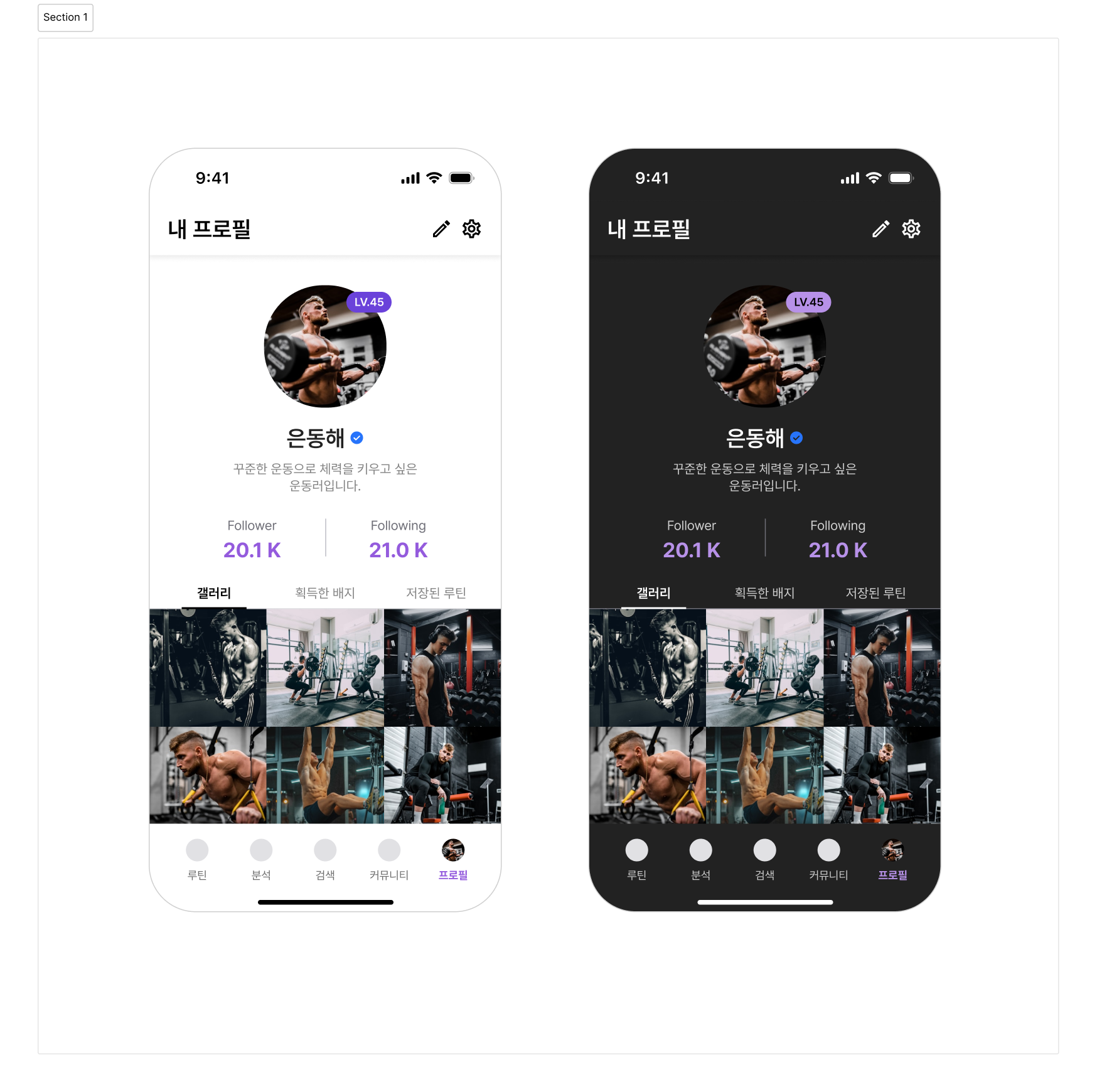 이런 식으로 프로필 디자인은 해봤는데요! SNS의 특성과 운동 루틴 서비스를 결합한 방식의 '유저 프로필 디자인'입니다. 팔로워와 팔로잉 수, 운동했던 기록을 사진으로 인증(오운완🔥)할 경우 프로필에 자동으로 아카이빙 되는 갤러리 탭, 운동 루틴을 꾸준히 완수하며 얻은 배지를 확인할 수 있는 탭, 개인만의 운동 루틴을 확인할 수 있는 탭 등을 생각해 봤습니다.