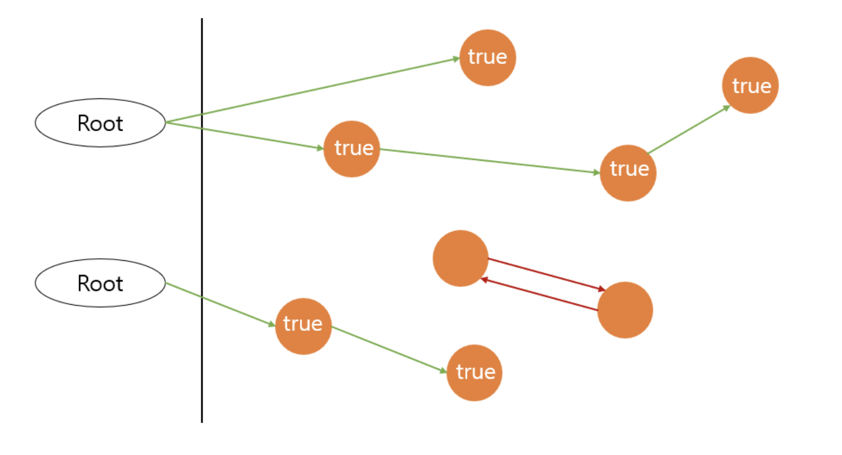 가비지 컬렉터는 가비지 컬렉터 루트(GC Root)로부터 순차적으로 연결된 객체들을 카운트하지만 참조로 연결되어있지 않은 객체들만 가비지 컬렉팅을 수행하는데, 순환 참조중인 객체들은 GC 루트와 연결되어있지 않지만 참조되어있는 상태라 가비지 컬렉팅을 수행하지 않습니다. 가비지 컬렉팅이 되지 않으면 메모리 누수가 발생하겠죠.