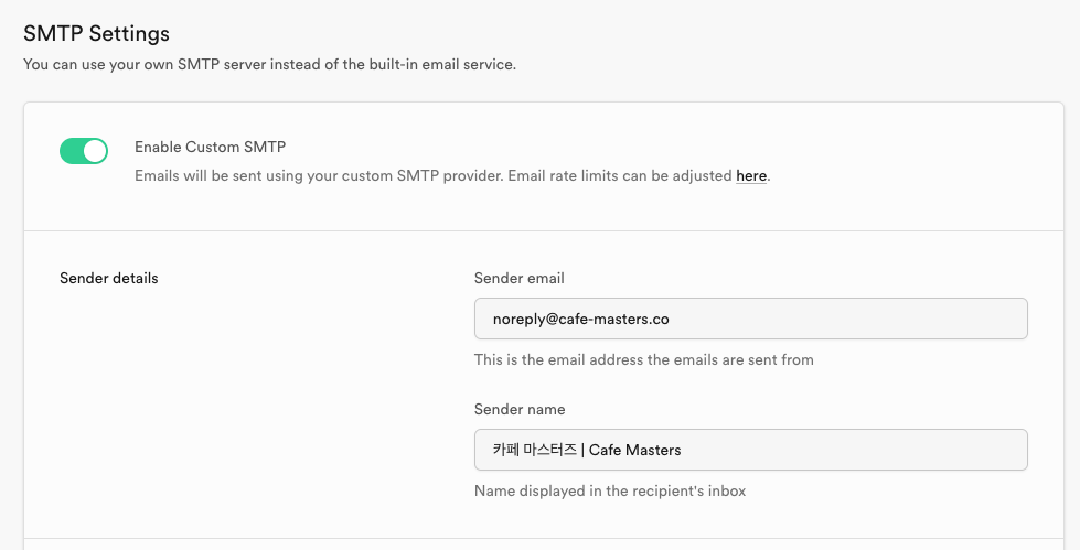 그럼 이렇게 SMTP Settings라는 섹션이 나오게됩니다. 먼저 Enable Custom SMTP 토글을 활성화시켜줍니다.