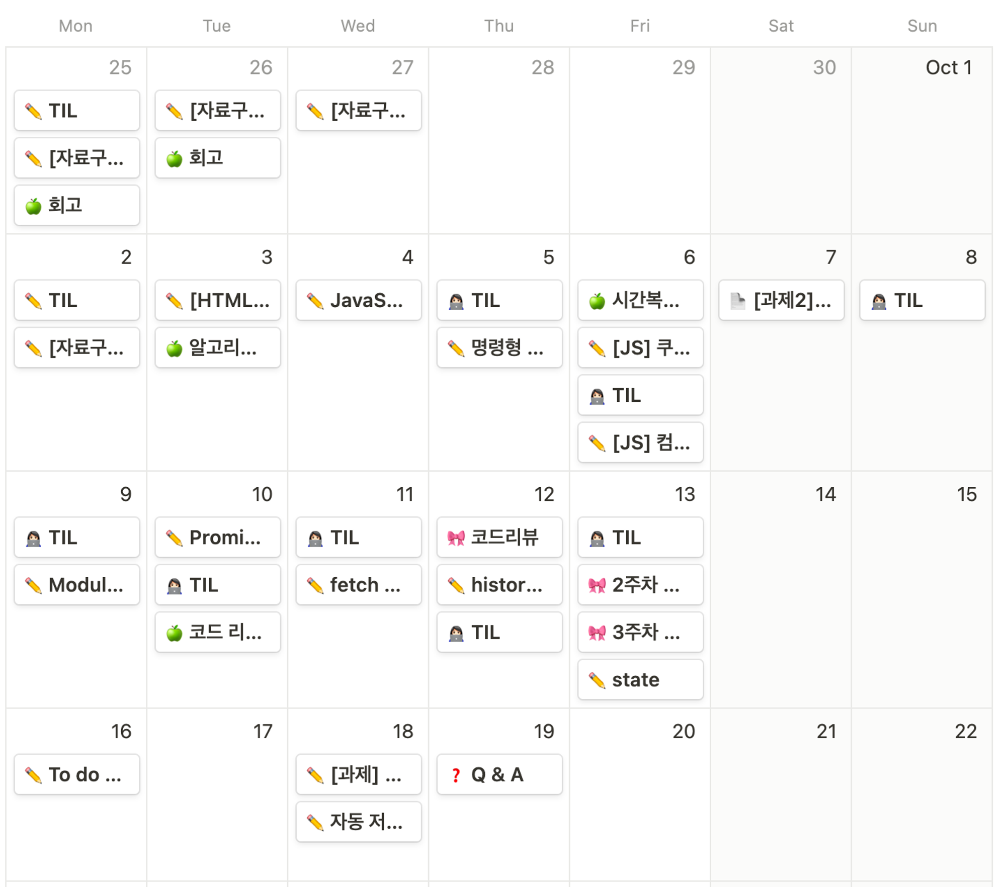 한달이라는 시간 동안, 책상에 앉아있는 시간은 데브코스를 하기 전보다는 확실하게 길어졌다. 그러나 앉아있는 시간에 비해 효율성이 좋은 편이 아닌 것 같다. 내 스스로 일단 할게 많아 분주한 느낌이다. 앞으로는 빨리 해치우려고 하기 보다는 해야할 것을 잘 정리하고, 깊게 공부해야겠다.