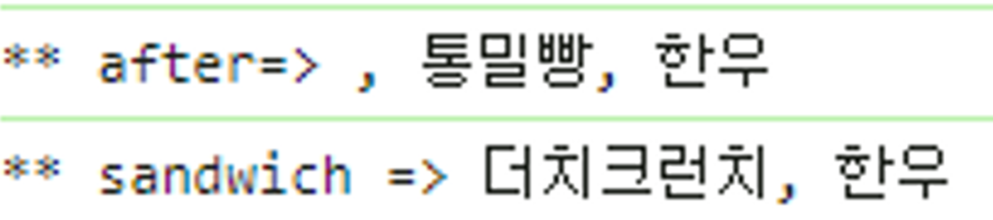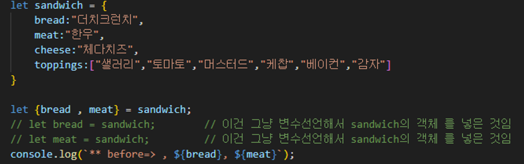 샌드위치 객체에서 bread와 meat 객체구조분해를 해서 각각의 값을 할당하였다.