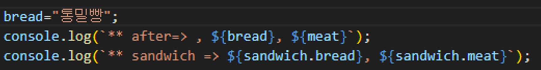 만약 bread의 값을 통밀빵으로 재할당하고 샌드위치 객체를 console.log에 찍어보면 샌드위치 객체는 변함없다.