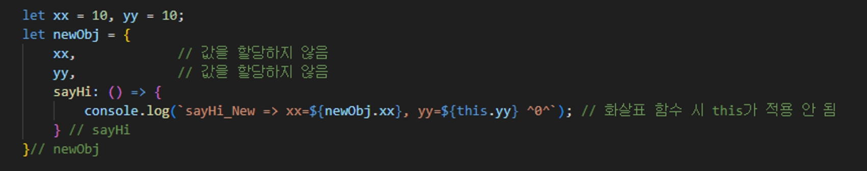 2-2) newObj에는 xx, yy 프로퍼티를 선언했지만 값은 할당하지 않음
