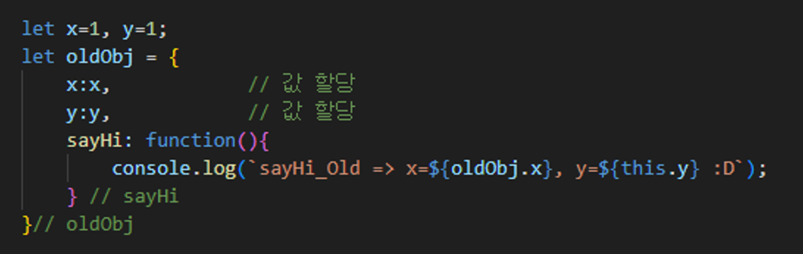 1-2) oldObj에 x, y 프로퍼티를 선언하고 각각 x, y 의 값을 할당 함