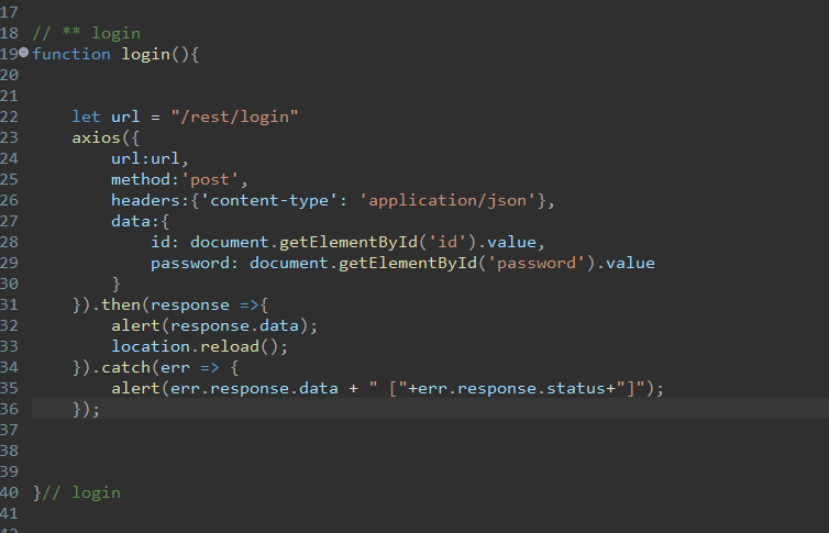 login을 RESTContoller에 POST메소드, json타입의데이터 형태로 axios 요청을 보내고 200번대 정상 status가 응답이오면 alert 으로 출력을하고 그외 status가 들어오면 재입력 요청 문구와 함께 error status를 alert으로 띄운다.