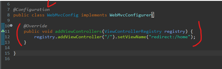 그리고 안에 registry.addViewController("/").setViewName("redirect:/home"); 을 줘서 '/' 요청만 와도 home으로 가도록 설정한다.