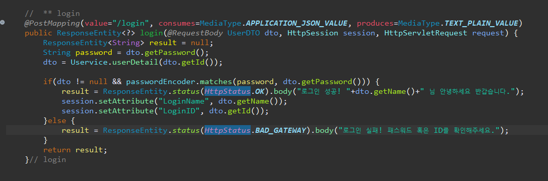 DB에서 가져온정보가 존재하고 요청받은 password와 DB의 password가 일치하다면 -> 로그인 성공, 세션에 userID, userName을 담고 정상 로그인 문구를 body에 담는다.