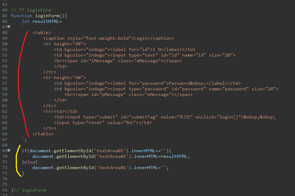 Login을 클릭시 LoginForm function이 실행되면서 로그인 폼이 textArea01에 나온다. 근데 만약 textArea01에 글이 없는 경우에만 폼이 생성되고 textArea01에 무언가 있으면 해당 HTML을 지우도록 했다.
