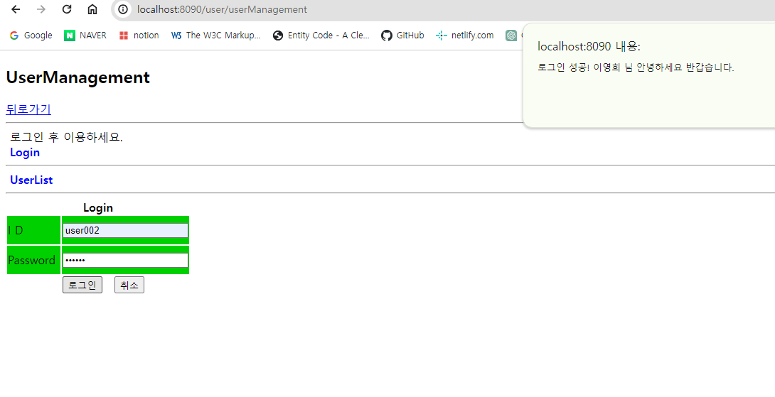 계획했던대로 ㅁㅁㅁ님 안녕하세요 alert창이 뜨면서 새로고침되고 ㅁㅁㅁ님 안녕하세요 문구가 UserManagement.jsp에 나온다. (Logout 창으로 바뀐 것도 확인할 수 있다.)