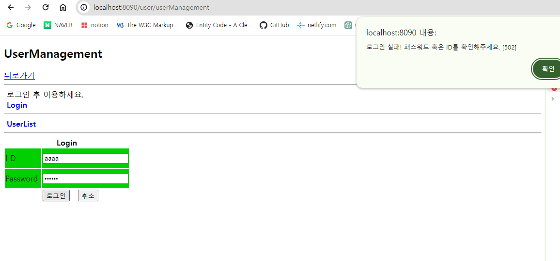 로그인 실패 alert 창이 뜨면서 status 값도 같이 띄워진다.