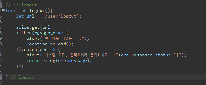 Usercontoller로 logout 요청을 보내면서 axios get방식으로 응답이 문제 없이 왔다면 로그아웃 alert 창을 띄운 후 새로고침을 해주고 아닐경우 시스템 오류 메세지를 띄운다.