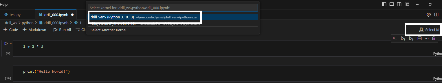 다 되면 select Kernel이 해당 가상환경으로 바뀐다.