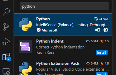 vscode의 extensions에서 python을 설치하여 py 확장자 파일을 실행할 수 있게 한다.