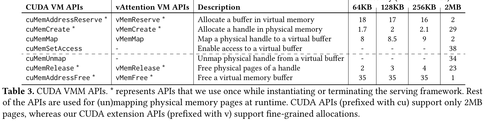 저자들이 vAttention을 구현하면서, 2가지 문제에 봉착했다고 한다. 우선 CUDA의 VMM API를 런타임 단계에서 실행하는 경우, 오버헤드로 인해 serving latency에 큰 지장을 주었다는 것이 있었다. 그리고 cuMemCreate API의 경우, 2MB의 배수 단위로 현재 가장 큰 page 할당을 하는데, 이로 인해 internal fragmentation이 발생한다는 점이다.