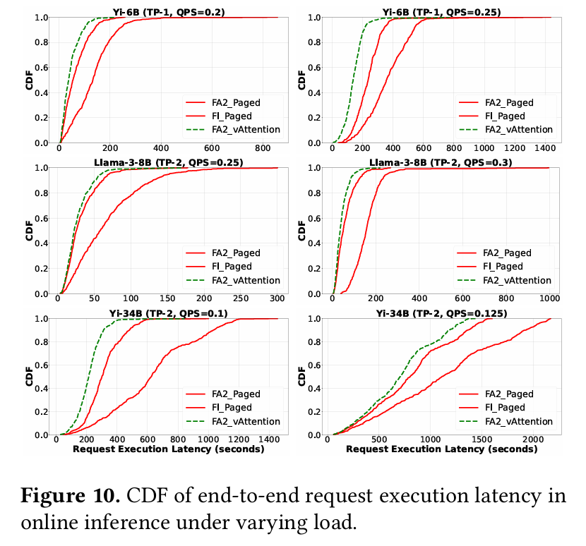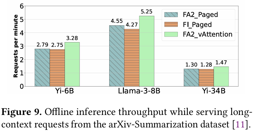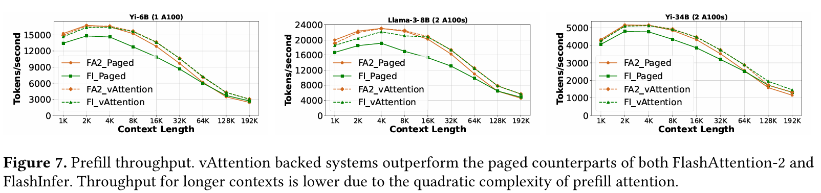 context 길이가 짧은 경우, FlashAttention-2 커널에 대해서는 vAttention이나 vLLM이나 세 모델 모두 큰 차이를 보이지 않았다. 반면 FlashInfer에 대해서는 vAttention이 vLLM에 비해 처리량이 개선 되는 것을 보여준다. 이는 vAttention이 가지는 비연속적인 KV Cache 할당으로 인한 특성인데, FlashInfer는 매 iteration마다 block table에 수정이 발생한다. 그러나 vAttention은 연속적인 할당으로 인해 block table이 필요하지 않기 때문에 이러한 오버헤드를 피할 수 있었다.