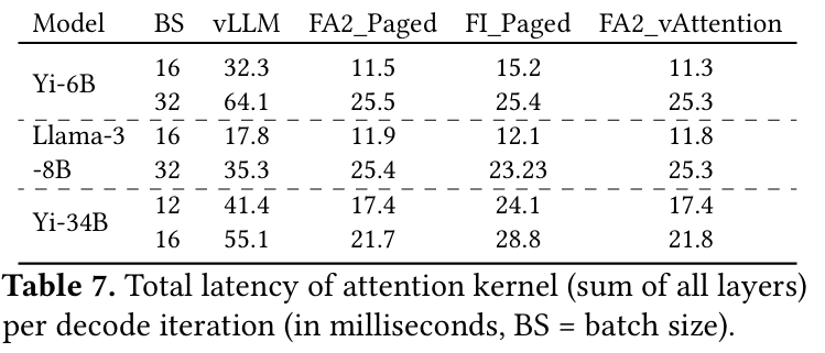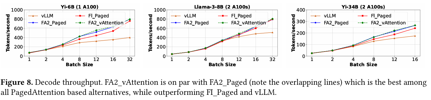 decoding의 경우, 최신 버전의 paged attention과 vAttention의 성능이 거의 비슷한데, 이는 decoding이 memory bound 성격이 강하기 때문으로 보고 있다. paging을 지원하기 위해서는 block table 연산과 같은 부가적인 연산을 수행하게 되는데, memory offloading에 많은 시간을 사용하는 decoding은 이러한 연산을 overlapping을 통해 가리기 쉽다. 반면 prefill은 compute bound 성격이 강해서 이 부분에서 paged attention의 오버헤드가 가려지지 못하기 때문에 성능 격차가 발생했던 것이다.