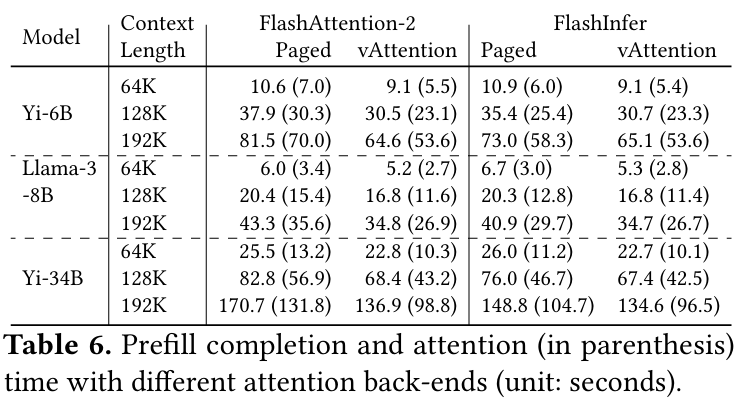 context 길이가 16K에 이를 정도로 길어지면 커널에 상관 없이 vAttention의 prefill 처리량이 더 높다. 이에 대한 원인 역시 vAttention이 가지는 연속적인 할당 덕분인데, context 길이가 길어질수록, prefill은 attention 연산에 더 많은 시간을 사용하기 때문이다.