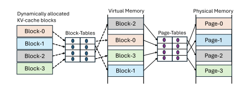 vLLM은 serving framework의 레벨에서 블록을 virtual address에서 physical address로 변환하는 작업을 사실상 2번을 하게 된다. vAttention 논문에서 나온 위 그림이 그 예시 중 하나이다. 들어온 요청에 대해서 4개의 블록이 존재한다고 가정하면, 4개의 블록은 vLLM의 블록 테이블에 따라서 실제로는 virtual memory의 블록과 매핑이 되고, 그리고 OS 레벨에서 다시 매핑이 된다. 그렇기 때문에 실제로는 중복된 작업을 한다고 주장한다.