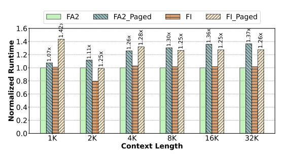 위 그래프는 FlashAttention-2와 FlashInfer 커널에 Paged Attention 여부에 따른 Prefill 단계에서의 성능 변화를 나타낸 그래프이다. 위와 같은 오버헤드로 인해 실제 Prefill 단계에서는 Paged Attention의 latency가 증가하게 된다.