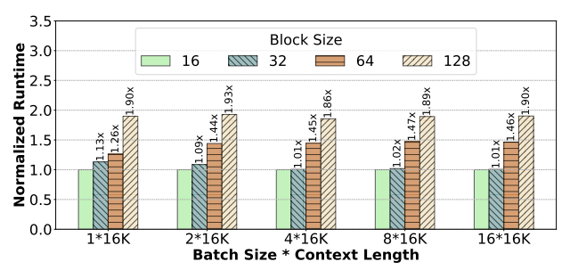 그리고 위 그래프는 블록 크기에 따른 decoding 단계에서 발생하는 오버헤드로 인한 성능 감소 그래프이다. 작은 블록일수록 L1 캐시 적중률이 높아 memory bandwidth의 활용도가 향상되는데, 블록 사이즈가 커지면서 Paged Attention은 그만큼 성능 감소가 더 크게 발생하게 된다.