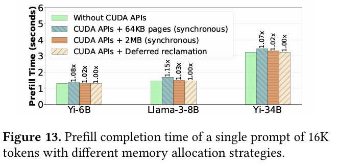 위 그래프는 CUDA API의 synchronous 방식과 VMM API를 이용 했을 때, 그리고 지연 할당을 사용 했을 때를 비교한 그래프이다. synchronous API를 사용하더라도, 지연 할당을 사용하면 메모리를 다시 할당하는 경우가 발생하지 않기 때문에 VMM API를 이용했을 때와 거의 동등한 성능을 달성할 수 있다고 한다.