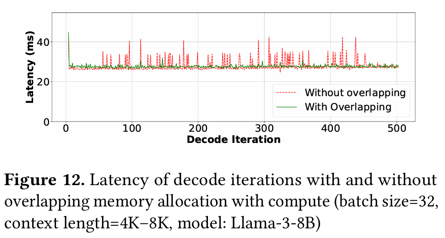 위 그래프는 decoding 단계에서 메모리 할당에 대한 overlapping 유무에 따른 latency를 기록한 그래프이다. overlapping을 사용하지 않은 경우, 메모리 할당으로 인해 spike가 발생하는 구간이 생긴다.