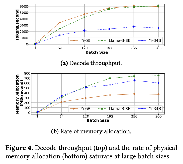 앞서 언급한 4가지 vLLM이 갖는 문제점에 대해 해결법을 제시하기 전에, vAttention 저자들은 LLM inference 워크로드를 분석하면서 몇가지 특징을 잡아내었다. Yi 6B, 34B와 LLaMA-3 8B 모델을 배치 사이즈를 증가 시키면서 decoding 단계에서 throughput과 메모리 할당에 대해 분석하였다.