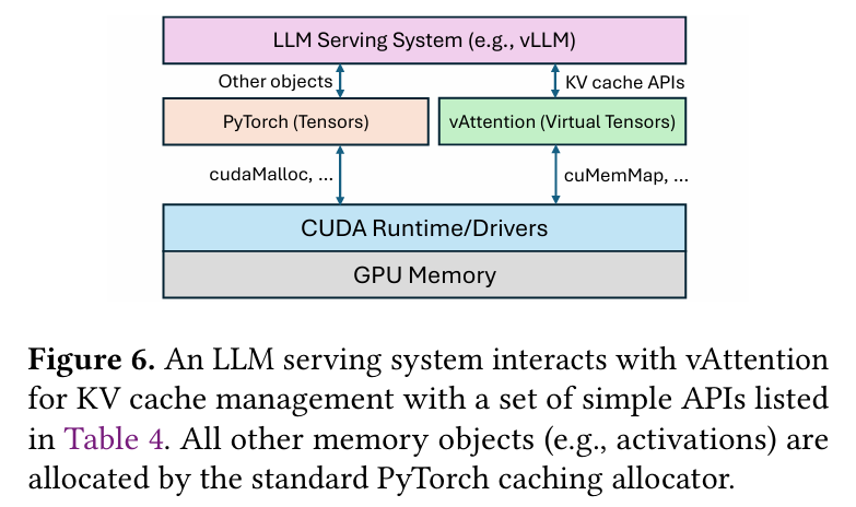 vAttention은 이와 다르게 좀 더 low-level인 CUDA VMM API를 사용하여 PyTorch의 caching allocator를 확장 시켰다. VMM API는 CUDA 10.2 버전 이상부터 추가 된 메모리 관련 API들로, 기존의 cudaMalloc과 다르게 virtual memory 예약과 physical memory 할당이 분리 되어 있다.