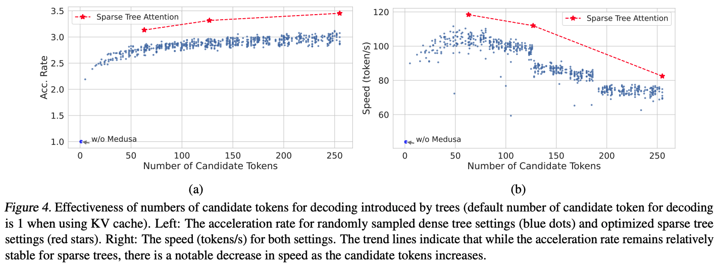 위 그래프는 tree attention에 대한 실험이다. 빨간 선은 최적화 된 sparse tree 구성이고, 파란 선은 무작위로 샘플링 된 dense tree 구성을 의미한다. (a) 그래프에서 sparse tree는 노드 수가 64개 밖에 되지 않음에도 256개의 노드를 가지는 dense tree보다 더 높은 성능 향상을 보여준다. (b) 그래프에서는 실제 토큰 생성 속도가 감소하는데, 이는 tree가 복잡해지면서 발생하는 계산량 증가로 인한 오버헤드가 원인이 된다.