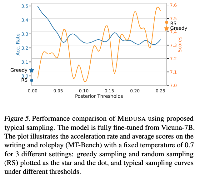 위 그래프는 typical acceptance의 threshold 값에 따른 모델 성능 비교를 보여준다. 값을 0.01에서 시작하여, 0.25까지 0.01 단위로 증가시켰을 때, 다음과 같은 trade-off를 발견했다고 한다.