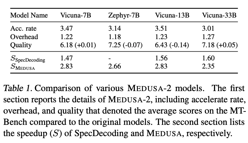 위 표는 self-distillation을 사용 했을 때, Medusa-2 모델의 속도 향상 비율, 추론 시 발생하는 오버헤드, 그리고 MT-bench 평가 점수를 비교한 결과이다. 모든 모델에서 Medusa의 속도는 향상이 되었고, Vicuna 33B의 경우 출력 품질 또한 원본 모델과 거의 동일하게 유지가 되었다.