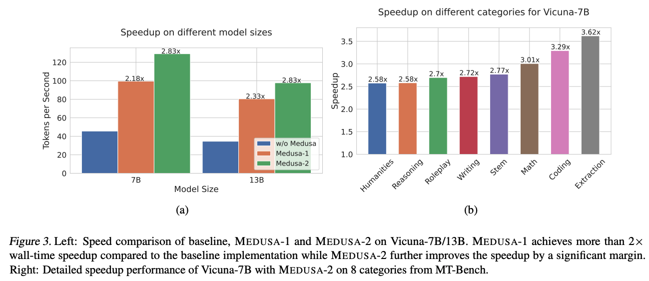 위 그래프는 Vicuna 모델에서 베이스라인을 huggingface를 사용하여 Medusa의 토큰 처리 속도 향상을 나타낸 그래프이다. Medusa-2는 다양한 카테고리에서도 속도 향상이 이루어졌다.