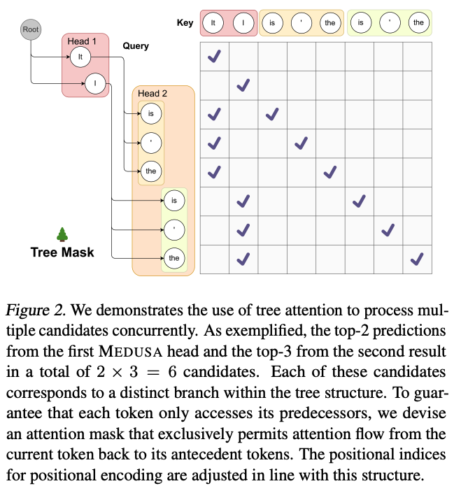 tree attention은 이전의 causal attention과 다른데, 이는 같은 연속되는 sequence 내 토큰만 historical data로 사용 된다. Medusa는 top-down 방식으로, Medusa head에서 생성한 draft 구조를 기반으로 트리를 생성한다.