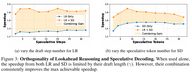 Lookahead reasoning은 step 단위의 speculative decoding인데, 이를 기존에 사용하던 토큰 단위의 speculative decoding과 동시에 적용 할 수 있다. 하지만 적용하는 것과, 실제로 적용을 했을 때 성능 이득이 존재 하는지에 대한 여부는 별개다.